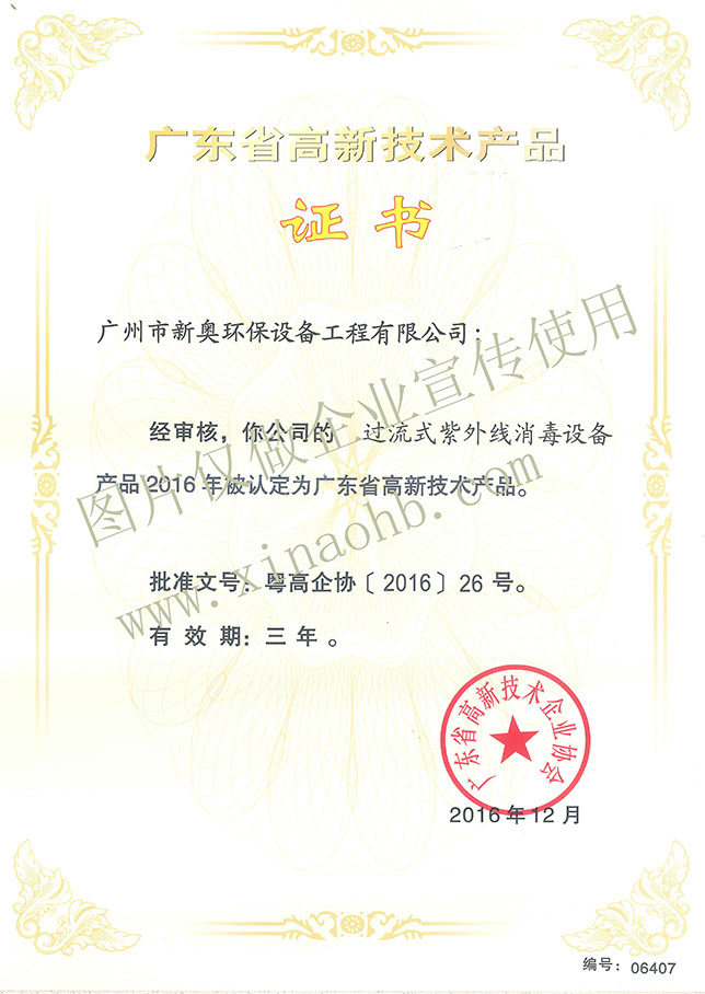 2016年12月,广州市新奥环保设备工程有限公司在全体员工的共同努力下,经过严格的层层审查,zui终喜获由广东省高新技术企业协会颁发的《广东省高新技术产品证书》,此次获得高新技术产品认定的产品有三个,分别是“明渠式紫外线消毒设备装置、过流式紫外线消毒设备和二氧化氯复合消毒发生器”。